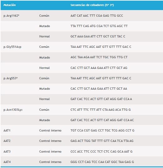 Tabla 1. Secuencias de cebadores usados para la detección de mutaciones mediante la técnica ARMS-PCR.