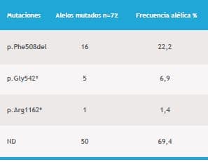 Quince de los 36 pacientes (41.6%) fueron positivos para al menos una de las diez mutaciones evaluadas. Asimismo, se detectaron tres (p.Phe508del, p.Gly542*, p.Arg1162*) de las diez mutaciones más frecuentes evaluadas. De los 72 alelos analizados, 22 fueron positivos (30,6%). La mutación p.Phe508del fue la más frecuente y se encontró en 16 de un total de 72 alelos (22,2%), la mutación p.Gly542* en cinco alelos (6,9%), y la mutación p.Arg1162* en un alelo (1,4%) (Tabla 2).