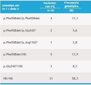 En el caso de frecuencia genotípica, el genotipo más frecuente fue el p.Phe508del/ND que estuvo presente en cinco de los 36 pacientes (13,9%), seguido del genotipo p.Phe508del/p.Phe508del con cuatro pacientes (11,1%) y p.Gly542*/ND con 3 pacientes (8,33%) (Tabla 3).