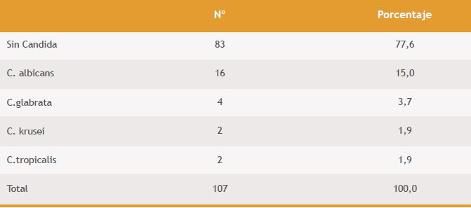 En la Tabla 1 se aprecia que del 100% (n=107) de las muestras, un 77,6% no presentaron colonización por el género mientras que un 15% presentaron la especie C. albicans, seguida C. glabrata 3,7%, y finalmente iguales porcentajes de C. krusei y tropicalis con 1,9%.