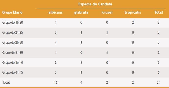 La prevalencia de muestras analizadas según la distribución de las especies de Candida en diferentes grupos etarios se presentan en la Tabla 2, observándose 6 aislamientos para el de 41-45 años, donde C. albicans agrupa 5 colonizaciones y una para C. glabrata, con igual número de aislamientos está el grupo etario de 21 a 25 años y 26 a 30 años con 5 aislamientos, donde C. albicans tiene el mayor número (3 y 4 aislamientos) y el grupo de 16 a 20 y 36 a 40 presentaron 3 colonizaciones para el género, 2 para C. tropicalis y 1 para C. albicans (16-20 años) y 2 para C. albicans y 1 C. glabrata (36- 40 años).