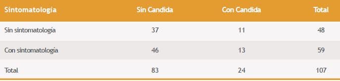 Al asociar la sintomatología como prurito, escozor, ardor, flujo blanquecino, entre otros con la presencia de Candida en este estudio, no se pudo establecer una relación significativa como un factor determinante en la colonización por Candida; ya que los datos estadísticos son heterogéneos, y solo 24 pacientes de las 107 estudiadas presentaron Candida, de las cuales 11 de ellas resultaron positivas asintomáticas y 13 positivas sintomáticas. En la literatura consultada se refiere que la mayoría de los pacientes que presentan Candida son asintomáticos (6-8).