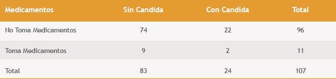 La presencia del género según la ingesta de medicamentos se observa en la Tabla 5; de los 107 pacientes, 96 en el momento no se encontraba bajo tratamiento antimicótico-antibacteriano, de las cuales 74 no estaban colonizadas por el género y 22 si presentaron Candida. Por su parte 11 pacientes se encontraron bajo la ingesta de medicamentos, donde 9 no se les aisló Candida y sólo 2 presentaron el género.