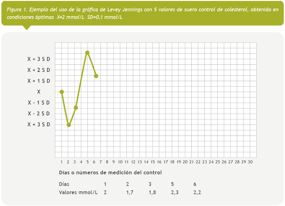 Gráfica de Levey-Jennings: Se utiliza para simplificar la comparación del valor observado en el día para un material de control estable, con lo que se espera, sobre la base de los valores históricos obtenidos con anterioridad. La idea es que para un procedimiento de medida estable, las nuevas mediciones del control deberían mostrar la misma distribución que las pasadas o históricas. Una vez que se obtienen los valores del control en condiciones óptimas, se confecciona la gráfica con un sistema de ordenadas, donde se fija la media en el eje de las Y, hacia arriba los valores de la X más 1,2 y 3 SD y hacia abajo la X menos 1,2, 3 SD. Se comienzan a trazar los nuevos valores del control que son obtenidos día a día como parte del trabajo diario (Fig. 1.).