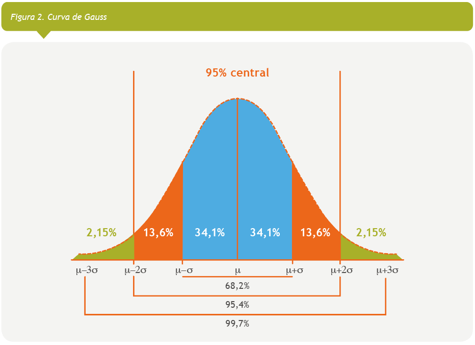 La decisión de utilizar ± 2SD como límites de confianza o de control se basa en la distribución del área bajo la curva de Gauss, que se conoce como distribución normal (Fig. 2.). Para los propósitos de las cartas para el control de la calidad en el laboratorio y como los errores aleatorios se distribuyen normalmente (distribución gaussiana, distribución normal, distribución de Gauss), el área bajo la curva entre ±2SD, comprende 95 % de la población (resultados, en este caso). De esta forma se puede asegurar, con 95 % de probabilidades, que, si los valores se mantienen dentro de estos límites, el componente está bajo control y solo queda 5 % de probabilidades de que no lo esté. Por esto, uno de cada 20 valores puede caer en las “zonas de alarma” entre los límites `X ±3 SD hasta `X ±2 SD. Esta situación puede indicar una falsa alarma en vez de un problema real. Si la cantidad de valores en la zona de alarma es mayor a la esperada estadísticamente (1/20) se considera como indicativo de que hay algún problema; si alternan entre los límites superiores e inferiores, el problema es de precisión; si se sitúan de un solo lado del promedio, es un problema de exactitud o veracidad.