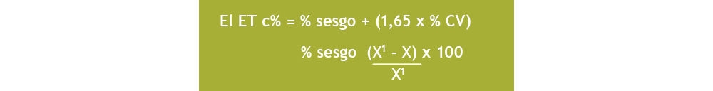El error total se calcula para evaluar la competencia analítica del método que es aceptada cuando el ETc es menor que el ETa. Se calcula con el sesgo, el CV y el Eta, donde: