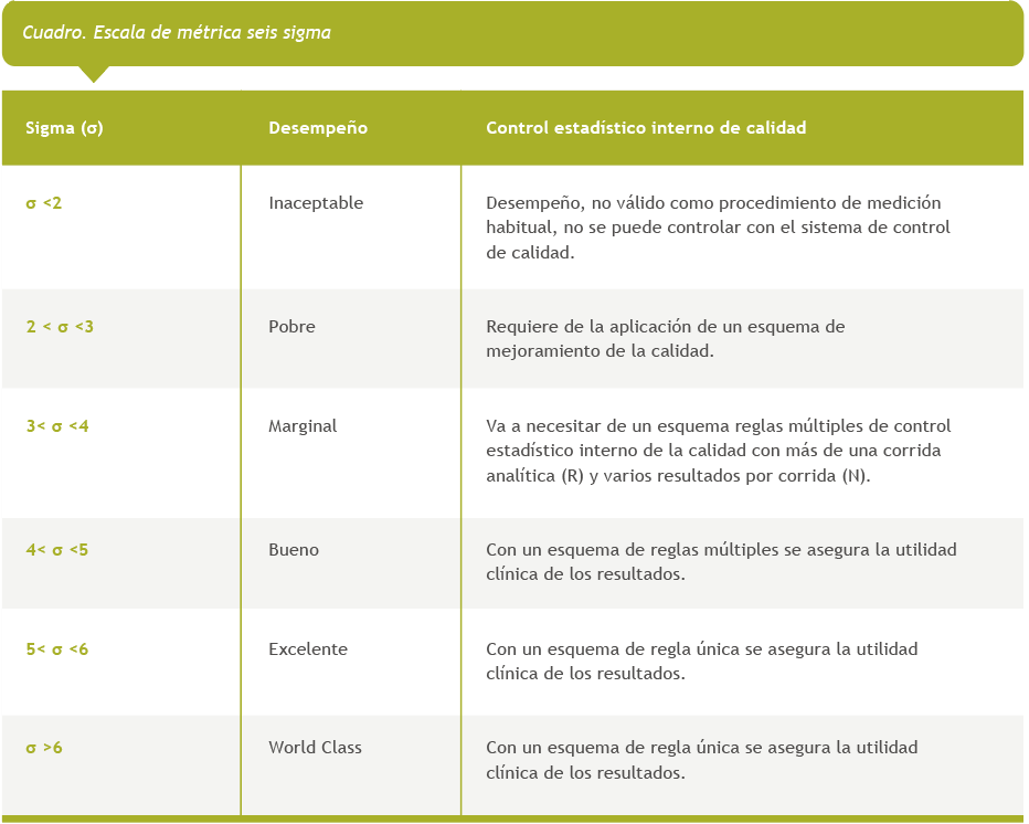 Seis sigma es un método para mejorar los procesos y disminuir la variabilidad de estos. Muestra la relación entre la meta o requisito de calidad (ETa), la precisión y el sesgo, que son determinados durante los estudios de validación de métodos en una etapa determinada no menor de 20 días, es decir, para estimar la métrica sigma se utiliza la medida de variación del proceso y se evalúa el desempeño analítico mediante categorías. Por tanto, es un indicador de mayor exigencia y mientras más desviaciones estándar del proceso entran dentro del error permitido, más alto será el valor de sigma y el proceso será más seguro.(10)