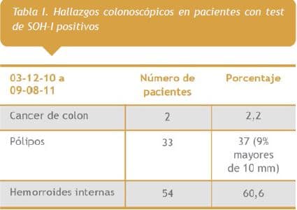 Los test inmunológicos de sangre oculta en heces (SOH-I) constituyen actualmente una de las estrategias más extendidas para el cribado de cáncer colorrectal (CCR) y lesiones precancerosas avanzadas. Objetivos: Describir los hallazgos colonoscópicos en una población de pacientes con test de SOH-I positivos y conocer además la relación con la presencia de CCR. Métodos: Se recabaron de manera retrospectiva los datos de pacientes con test de SOH positivos, prueba inmunocromatográfica, en el período 2007-2008 que tenían colonoscopía. Se excluyeron aquellos pacientes con, colonoscopía previa, enfermedad inflamatoria intestinal, colectomizados o hemicolectomizados, y aquellos con colonoscopía parcial y/o con mala preparación. Resultados: Se incluyeron 89 pacientes, 49 (55%) correspondieron al sexo femenino y 40 (45%) al masculino. Respecto a los hallazgos colonoscópicos: 2 (2,2%) presentaron CCR, 33 (37%) tenían pólipos (8 pacientes con pólipos mayor o igual a 10 mm), y hemorroides internas 54 (60,6%) pacientes. Conclusiones: La verdadera precisión de los test de SOH en términos de sensibilidad y especificidad para la detección de neoplasia colorrectal es difícil de conocer. Según estos hallazgos, la especificidad del test de SOH para el diagnóstico de CCR fue baja.
