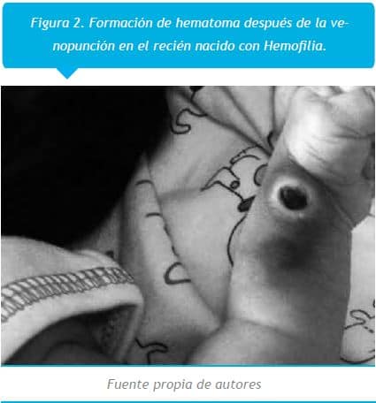 Las hemofilias son trastornos hemorrágicos hereditarios y se diagnostican frecuentemente a partir de los tres años de edad y muy pocas veces se manifiestan en el periodo neonatal (6). La hemofilia en el período neonatal supone un reto clínico de gran relevancia; el trauma del proceso de parto, la circuncisión, las inyecciones y las punciones en el talón someten al paciente a un estrés adicional (7). En este reporte de caso la hemofilia se manifestó como consecuencia de la realización de la venopunción realizada como tratamiento antibiótico de una onfalitis.