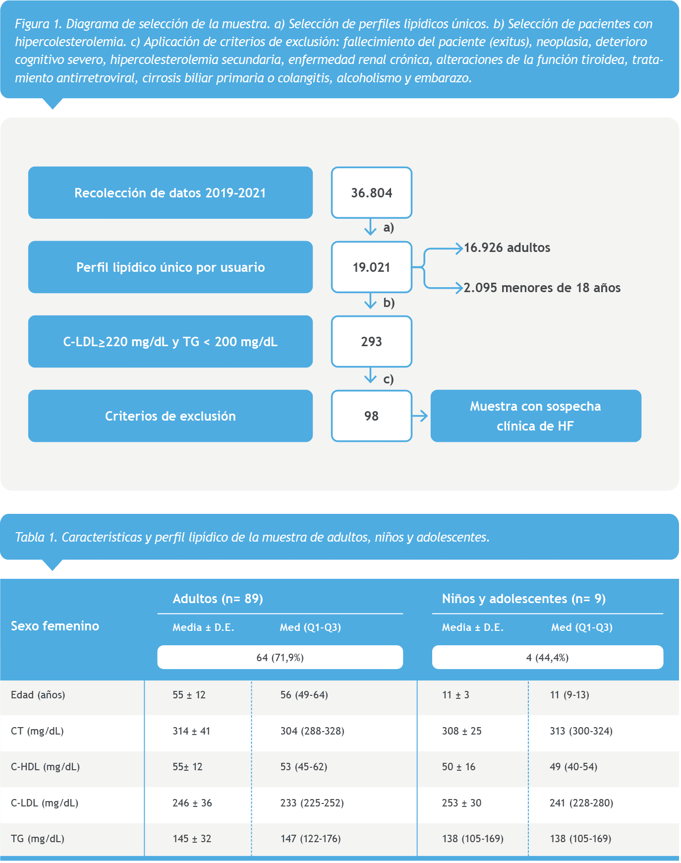 Results: 36,804 lipid profiles were obtained, of which 19,021 corresponded to a unique lipid profile per patient. After applying the exclusion criteria, 98 patients suspected of FH. According to the DLCN criteria, 5 patients were stratified with a definitive clinical diagnosis (DLCN ≥8) and 4 with a probable diagnosis of FH (DLCN 6-7). In 4 of the 6 patients who were contacted, 3 genetic variants associated with FH were identified.