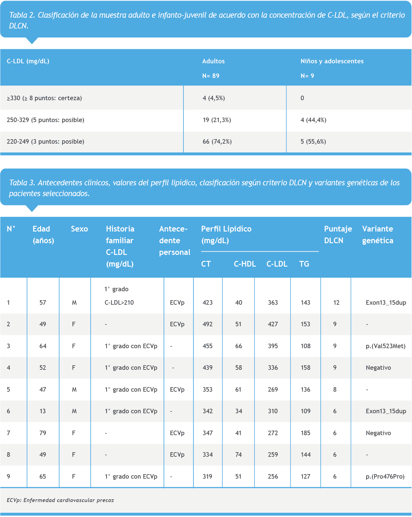 Posteriormente, y para identificar posibles CI de HF, se aplicó el criterio de la Red de Clínicas de Lípidos Holandesas (DLCN) a los 98 pacientes seleccionados. Al considerar los niveles de C-LDL, se identificó 4 pacientes adultos con diagnóstico de certeza de HF (8 puntos) y un total de 94 pacientes clasificados como posible HF (3 y 5 puntos) (Tabla 2). Luego, al incorporar el antecedente personal y/o de historia familiar de hipercolesterolemia o enfermedad cardiovascular prematura, se obtuvo que sólo un 23% (n= 22) del total de esta muestra contaba con este registro.