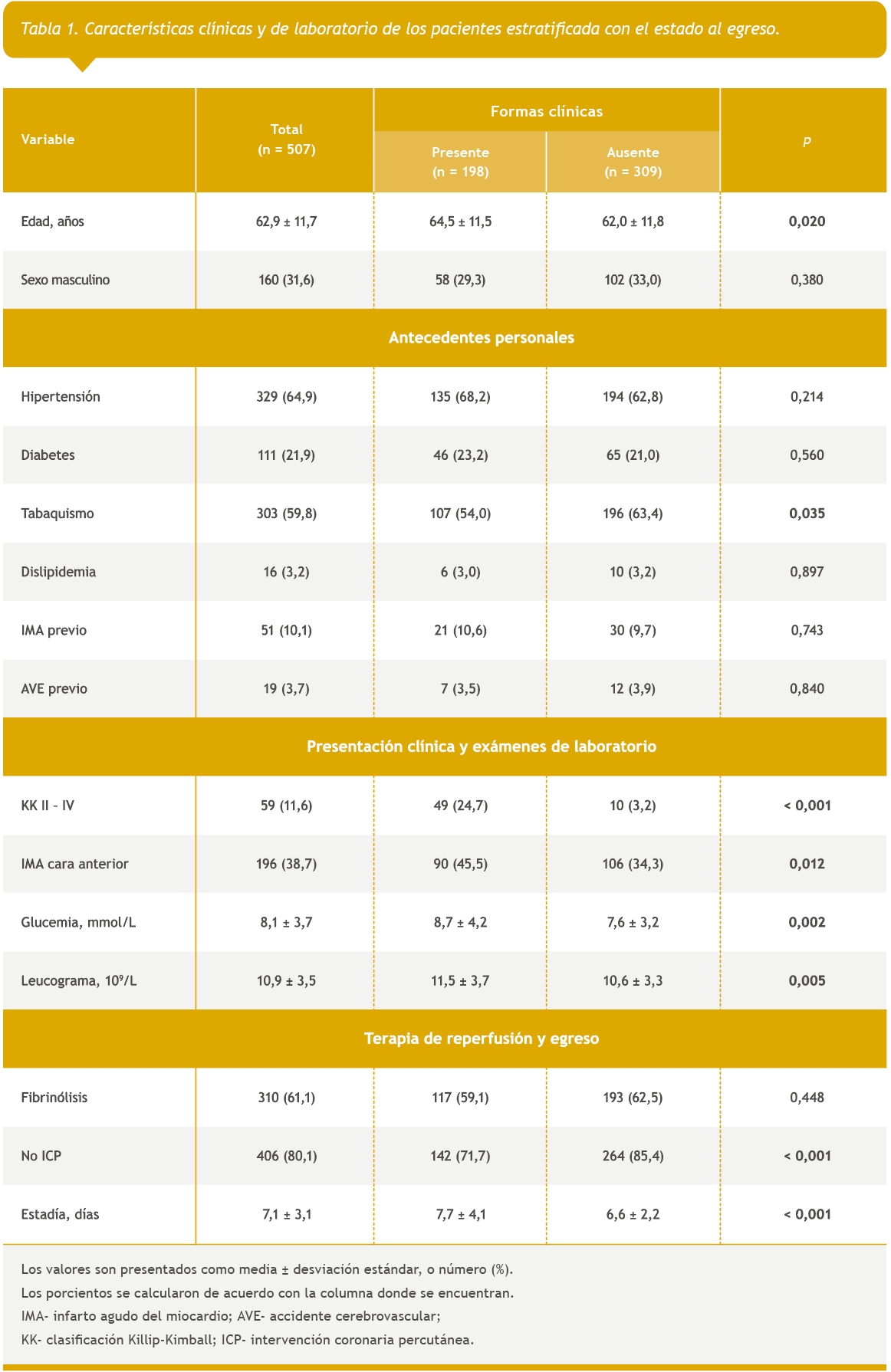 Se registró también la localización electrocardiográfica del infarto (anteroseptal, anterolateral, anterior extenso, lateral, inferior, inferolateral o posterior), la terapia de reperfusión empleada (fibrinólisis o intervención coronaria percutánea), la estadía hospitalaria (días), la ocurrencia de complicaciones intrahospitalarias, y el estado al egreso (vivo o fallecido), así como las cifras de la primera glucemia en ayunas (PGA, mmol//L) y el conteo total de leucocitos (109/L).