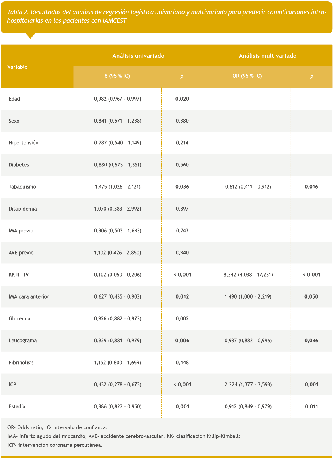 Conclusiones: La leucocitosis es un predictor independiente de complicaciones intrahospitalarias en pacientes con Infarto del miocardio agudo con elevación del segmento ST.