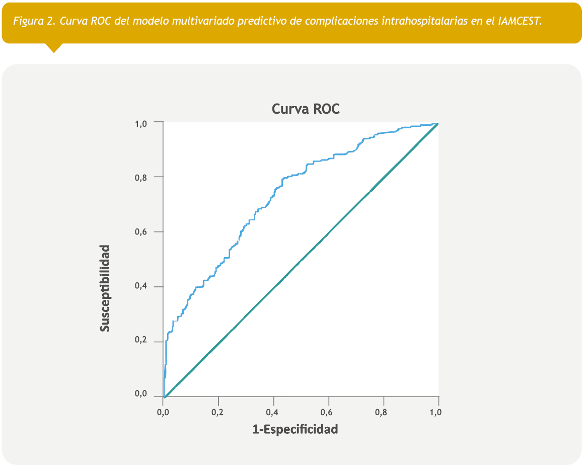 Los resultados de los análisis univariado y multivariado y los predictores de complicaciones intrahospitalarias en el IAMCEST se presenta en la Tabla 2. El análisis univariado reveló que la edad, los antecedentes de tabaquismo, una clase funcional ≥ II de KillipKimball, la localización anterior del IAMCEST, la glucemia, el leucograma, la no realización de ICP y la estadía hospitalaria, eran factores de riesgo de aparición de complicaciones durante el ingreso (todos con p < 0,05). Después de ajustar potenciales factores confusores, el análisis multivariado encontró que el antecedente de tabaquismo, la clase funcional Killip-Kimball ≥ II, el IAMCEST de cara anterior, los valores del leucograma, la no realización de ICP y la estadía eran predictores independientes de complicaciones intrahospitalarias en el IAMCEST