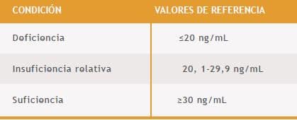 El Instituto de Medicina de los Estados Unidos considera que los niveles de vitamina D son insuficientes cuando la concentración de 25-OH-D3 sérica se encuentra por debajo de 50nmol/L (<20ng/ mL) y deficientes cuando son menores de 30nmol/L (<12ng/mL)8. Sin embargo, muchos otros autores, entre ellos incluídos el Task Force del Subcomité de Directrices Clínicas de la Sociedad de Endocrinología y diversas sociedades académicas de la Comunidad Europea, consideran que los niveles inadecuados o insuficientes son aquellos que se presentan cuando la concentración sérica de 25-OH-D3 es inferior a 75nmol/L (30ng/mL) y deficientes cuando los niveles son inferiores a 50nmol/L1,8,11.