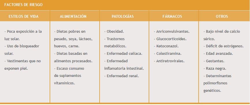 Por su parte, el déficit de estrógenos, generalmente asociado a la edad, también se considera como factor de riesgo, al igual que la disminución de la función renal, ya que disminuye su formación y la reabsorción de calcio. Algunos fármacos, especialmente los anticonvulsivantes, glucocorticoides, ketoconazol, colestiramina y tratamientos antirretrovirales también se consideran como factores de riesgo para la hipovitaminosis D35.