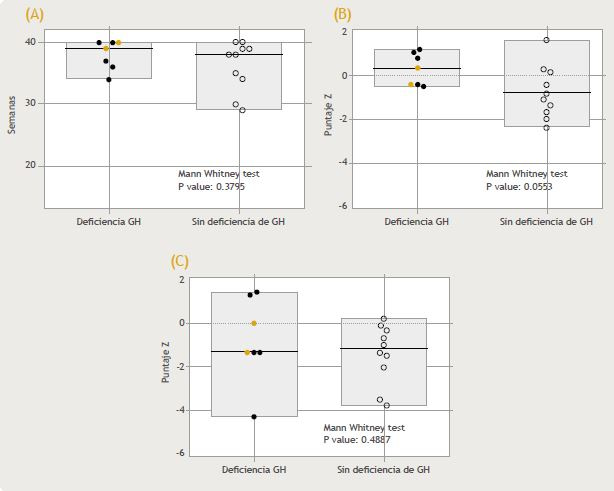 Figura 1 (A) Edad gestacional, (B) Peso de nacimiento, (C) Talla de crecimiento. Círculos rojos: deficiencia múltiple de hormonas hipofisarias. Círculos negros: deficiencia aislada de hormona de crecimiento. HC: Hormona de Crecimiento.