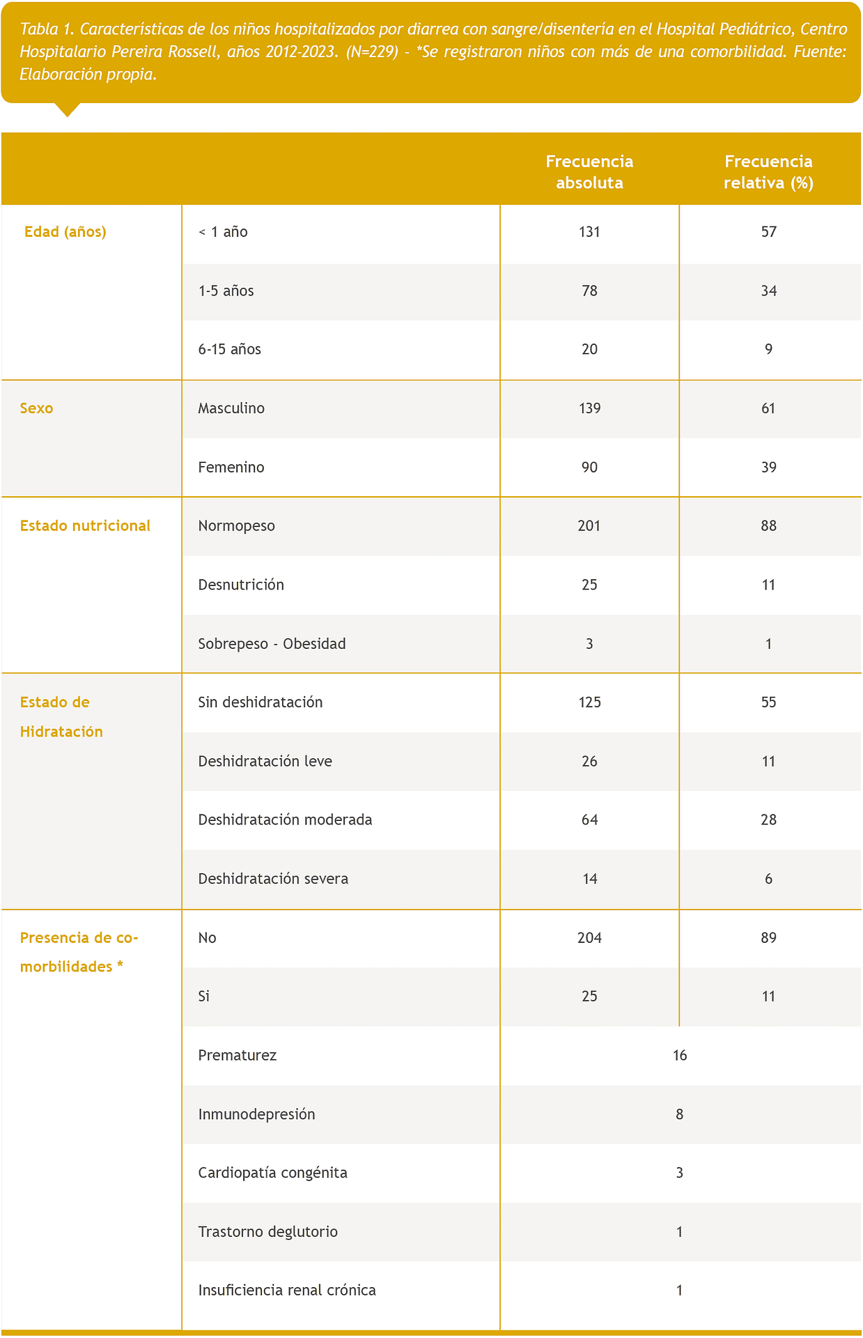 La mediana de edad fue 8 meses (rango 16 días – 13 años), sexo masculino 61% (139/229), normopeso al ingreso 88% (201/229), bien hidratados 55% (125/229), presentaban alguna comorbilidad 11% (25/229). En la tabla 1 se expresan las características de los niños hospitalizados por diarrea con sangre.