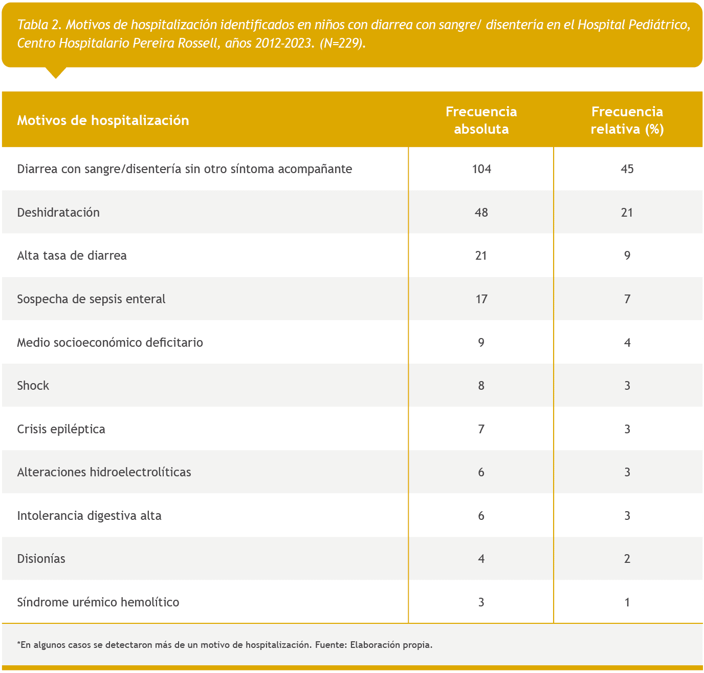 El motivo de hospitalización más frecuente fue la diarrea con sangre/disentería sin otro síntoma acompañante 45% (104/229), seguido por diarrea con sangre/disentería con deshidratación 21% (48/229). En la tabla 2 se expresan todos los motivos de hospitalización.