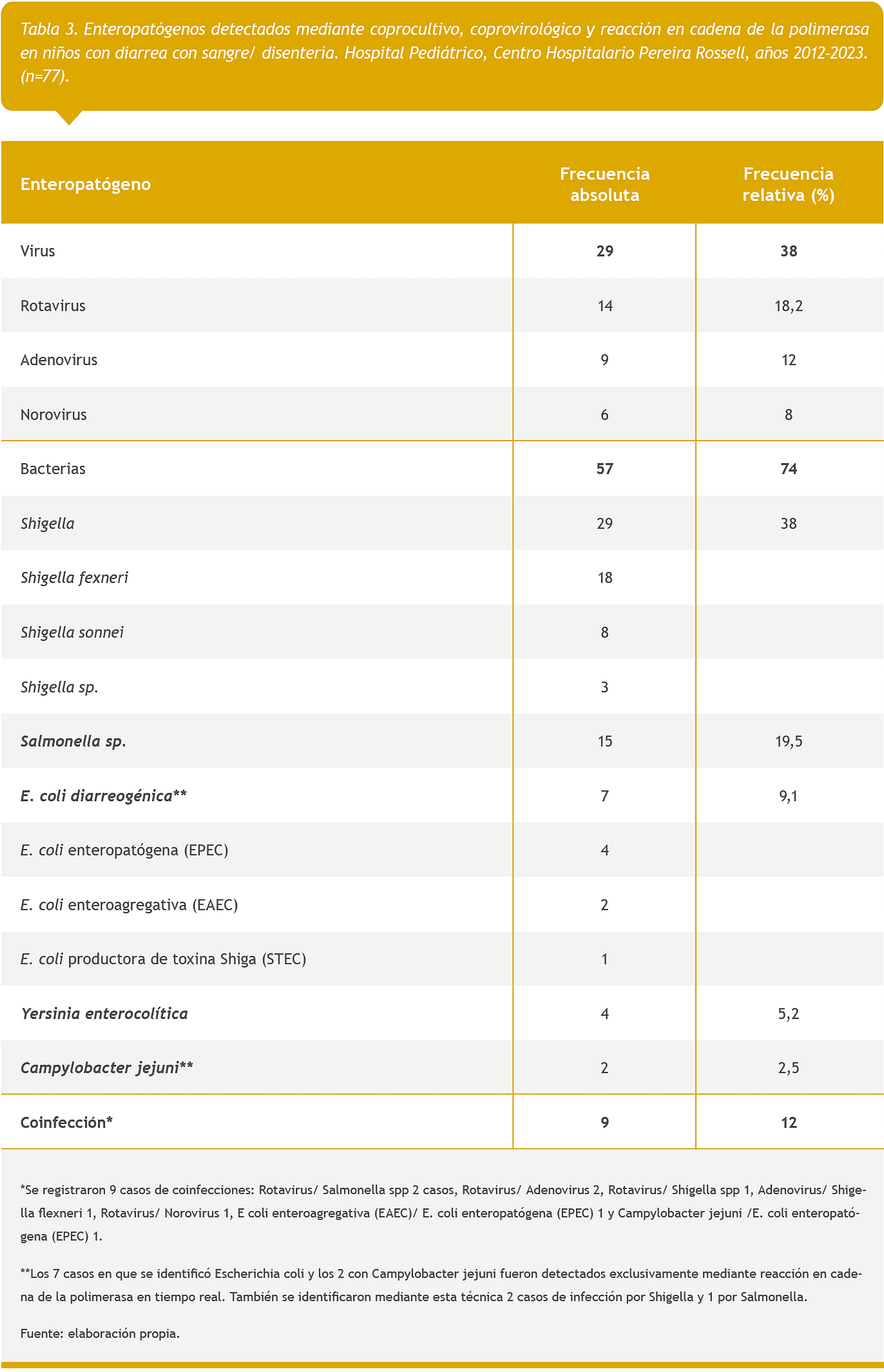 En la tabla 3 se muestran todos los resultados de los agentes identificados por coprocultivo, coprovirológico y RT-PCR.