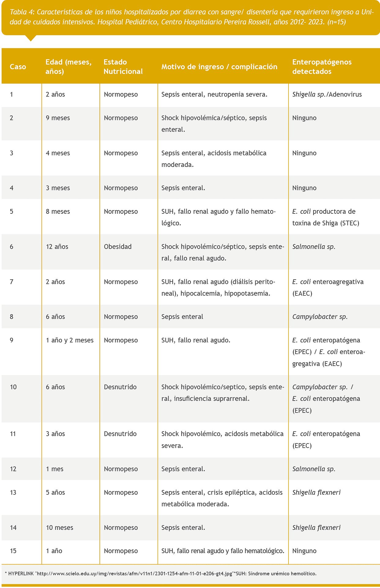 Requirieron ingreso a UCI 6,5% (15/229), mediana de edad 12,06 meses (rango 1 mes – 12 años), mediana de días de hospitalización en UCI fue 4 (rango 1 – 25 días). Todos presentaron complicaciones, la principal fue la sepsis enteral en 10/15, el fallo renal agudo en 5/15, en contexto de síndrome urémico hemolítico (SUH) en cuatro casos y el shock hipovolémico/séptico en 4 casos.