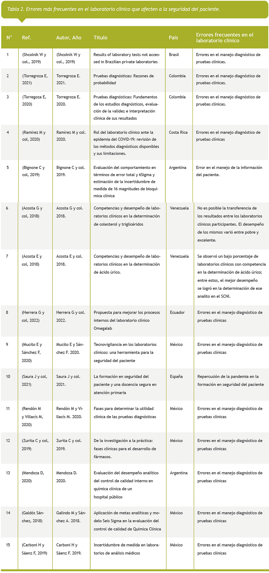Hablar de calidad en la actualidad no solo se refiere a los procesos industriales que dan como resultado objetos materiales con determinadas características, pues si lo aplicamos al ámbito clínico, se refiere al cuidado de la salud de los pacientes, previene errores prevenibles y requiere un ambiente seguro, un proceso que beneficia al paciente. Los laboratorios clínicos son parte de esta industria de la salud y, por lo tanto, están sujetos a errores en gran medida evitables. El propósito de este artículo es promover y aplicar la seguridad del paciente en el laboratorio clínico. Los métodos utilizados fueron de tipo literatura, y para la búsqueda de información se utilizaron bases de datos apropiadas como PudMed, Scielo, Scopus, Web of Science, Elseiver, Scholar, etc. Para acceder y leer revistas revisadas por pares, se realizaron búsquedas por año de publicación y últimos cinco años, es decir, de 2017 a 2022. Se recopilaron un total de 45 artículos para apoyar los objetivos específicos identificados aquí. El estudio también concluyó que existe la necesidad de diagnosticar la situación de seguridad del paciente en los laboratorios clínicos. También se determinó que los errores más frecuentes que afectan la seguridad del paciente en los laboratorios clínicos son errores de carácter diagnóstico. Y se deben proponer acciones correctivas para reducir los eventos adversos que afectan a la seguridad del paciente, como la formación.