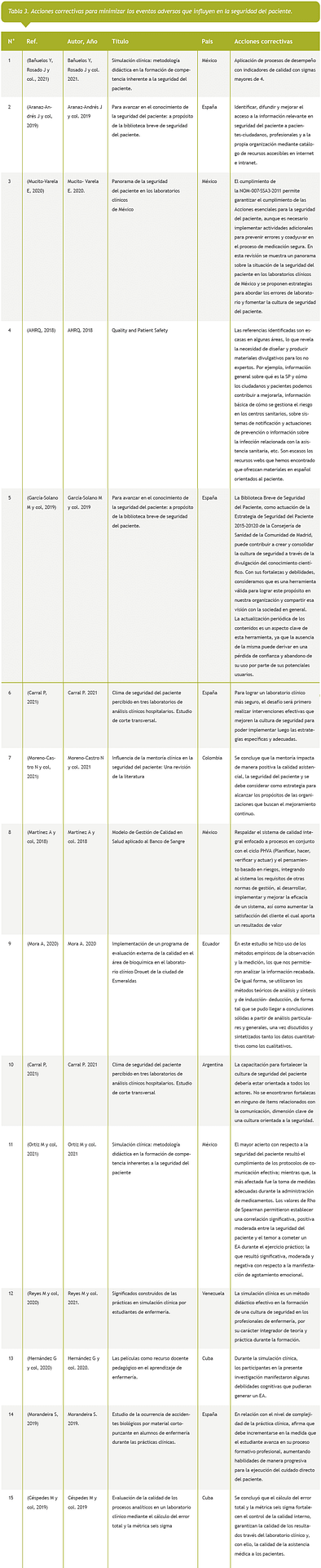 Talking about quality today not only refers to industrial processes that result in material objects with certain characteristics, because if we apply it to the clinical field, it refers to patient health care, prevents preventable errors and requires an environment sure. A process that benefits the patient. Clinical laboratories are part of this healthcare industry and are therefore subject to largely preventable errors. The purpose of this article is to promote and apply patient safety in the clinical laboratory. The methods used were of the literature type, and appropriate databases such as PudMed, Scielo, Scopus, Web of Science, Elseiver, Scholar, etc. were used to search for information. To access and read peer-reviewed journals, we searched by year of publication and past five years, i.e. 2017 to 2022. A total of 45 articles were collected to support the specific goals identified here. Our study also concluded that there is a need to diagnose the patient safety situation in clinical laboratories. It was also determined that the most frequent errors that affect patient safety in clinical laboratories are diagnostic errors. And corrective actions must be proposed to reduce adverse events that affect patient safety, such as training.