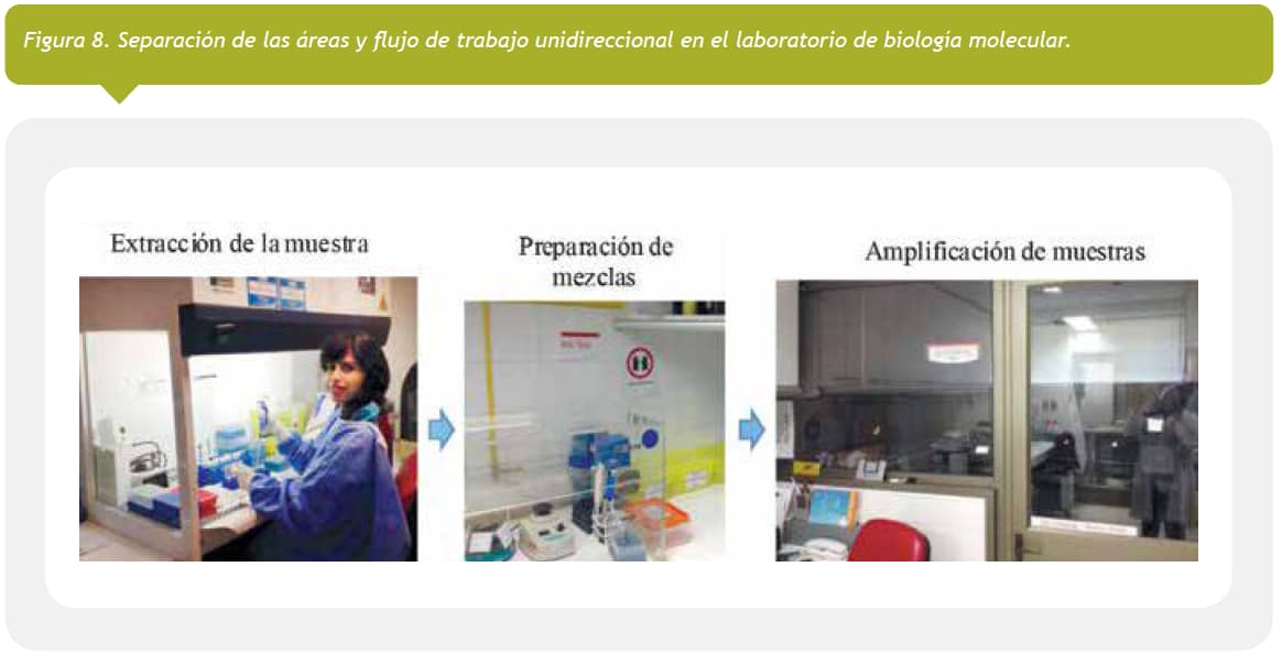 Los elementos clave de un laboratorio de biología molecular es la separación de las áreas y un flujo de trabajo unidireccional (Figura 8).