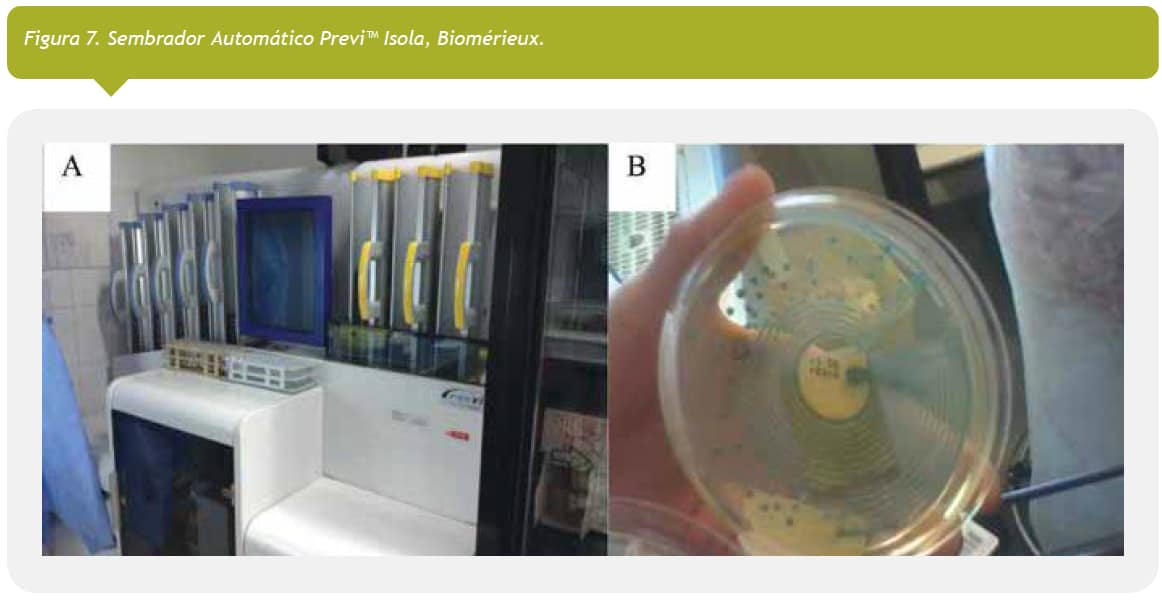 Además ha habido importantes cambios en los procesos que pueden ser automatizados de un laboratorio tradicionalmente considerado manual. Por ejemplo en la actualidad se cuenta con sembradores automáticos integrados en la rutina (Figura 7) e incluso incubadores automáticos que permiten analizar las colonias microbianas con un perfil de alta resolución, en pantallas táctiles, ampliar imágenes y analizarlas en un ambiente bioseguro (7, 8).