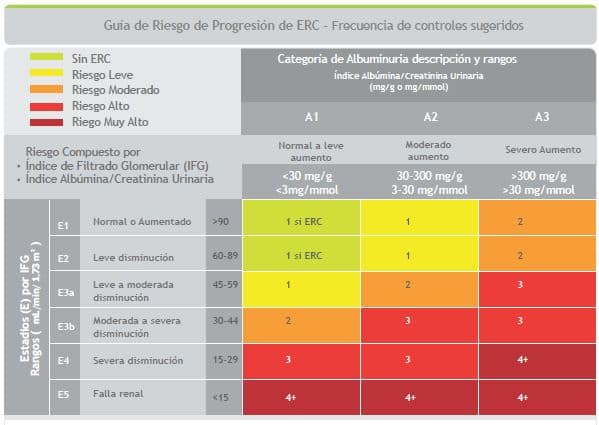 Figura 1. Guía de Riesgo de Progresión de ERC. Se muestra el IFG y la Albuminuria para reflejar el riesgo de progresión de la intensidad de la coloración. Los números de las cajas son una guía para la frecuencia de monitoreo (número de veces al año). Verde: refleja enfermedad estable, con seguimiento de las mediciones anuales si la ERC está presente; Amarillo: requiere precaución y las medidas de, por lo menos, una vez al año; Anaranjado: requiere mediciones efectuadas 2 veces al año; Rojo: requiere mediciones 3 veces por año; Rojo oscuro: requiere un seguimiento de aproximadamente 4 veces o más por año (por lo menos cada 1-3 meses). Modificado de referencia (27).
