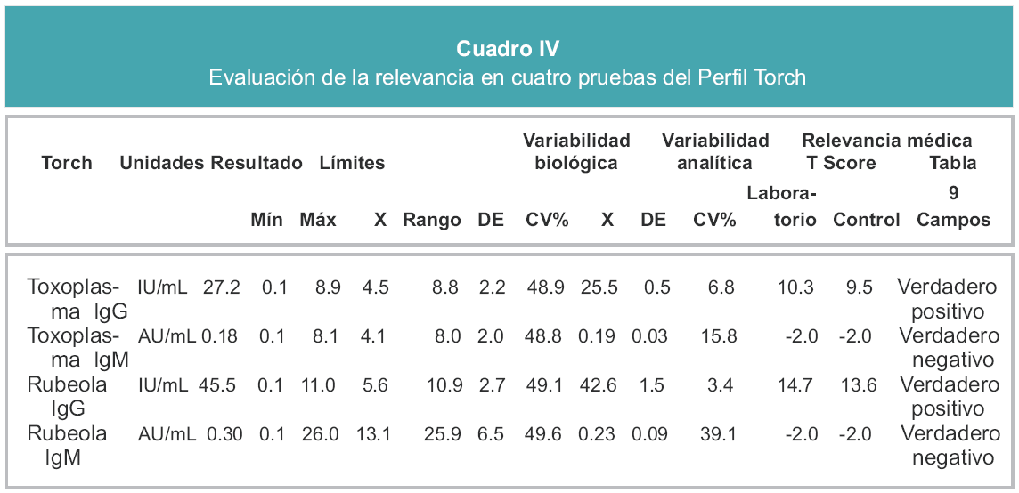 Como hemos visto, el cálculo del T Score es una herramienta práctica en variables continuas como la glucosa, colesterol, prolactina, triyodo-tironina, etc. Por lo que bien vale considerar su utilidad en pruebas inmunológicas, como son los marcadores tumorales, las pruebas para enfermedades infecciosas, etc. Tomemos el Perfil Torch (Cuadro IV) como ejemplo.