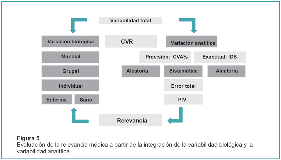 Como se puede observar, al aplicar la calificación T, es posible ubicar los resultados en la Curva de Gauss para que después se establezca un criterio diagnóstico preciso y confiable, conforme al cuadro de los 9 campos. Finalmente, de lo que se trata es de integrar toda la información que se obtiene a partir de la medición de la variabilidad biológica y de la variabilidad analítica, como se muestra en la Figura 5.