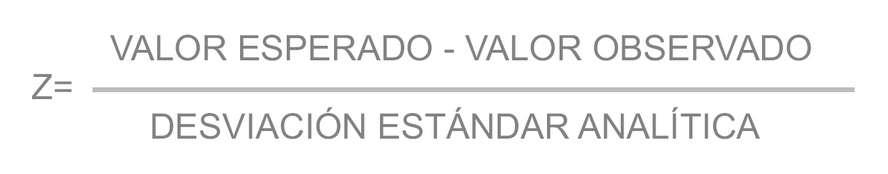 Esta prueba sirve para ubicar el resultado de un control analítico en la curva de Gauss que se obtiene a partir de la variabilidad analítica de una serie de controles. La fórmula para calcular el índice de desviación estándar analítico de una prueba, también denominado como «Z Score», es la siguiente:
