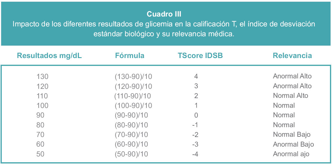 Ahora bien, supongamos que tenemos una serie de resultados de glucosa que van desde 50 hasta 250 mg/dL ¿Cuál sería la ubicación de cada uno de los siguientes resultados en la curva de Gauss con respecto a la mediana del rango normal? (Cuadro III).