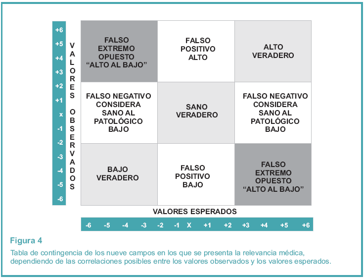 Al calcular los índices de desviación estándar biológico de los valores esperados y de los valores observados y ubicarlos en una tabla de contingencias de nueve campos se obtiene lo que se muestra en la Figura 4.