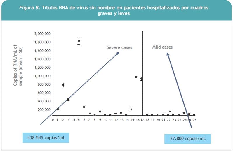 En un trabajo publicado en 2006 (5) se encontró que la carga viral observada en los pacientes con enfermedad leve era menor que en aquellos con enfermedad grave: 27.800 copias/mL versus 438.545 copias/mL, en promedio (Figura 8).