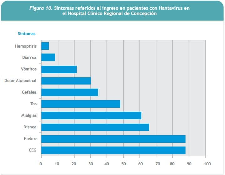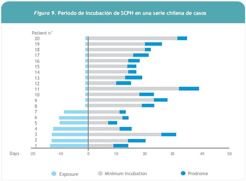 En el Hospital Clínico Regional de Concepción se ha diagnosticado SCPH en 23 pacientes, en su mayoría de sexo masculino (82,6%), de edad promedio 30 años con rango de 15 a 49. En cuanto a antecedentes epidemiológicos, la gran mayoría de los pacientes había realizado actividades agrícolas o forestales en zonas rurales (20 de 23 casos). El contagio habría ocurrido en actividad recreativa en 1 caso; en recinto penitenciario, en 1 caso y fue de origen suburbano en 1 caso. El período estimado de incubación fue 20 días, con rango de 18 a 25 días, similar a los datos publicados por el grupo de Vial en 2006 (6) (Figura 9).