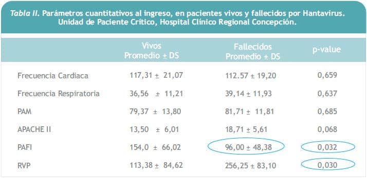 El manejo intrahospitalario de estos pacientes es de tipo invasivo, con catéter de Swan-Ganz, ventilación mecánica, corticoides y ocasionalmente, hemodiálisis. La hospitalización se mantuvo por 14 días en promedio; 11 de los pacientes estuvieron en la unidad de pacientes críticos; la tasa de letalidad del grupo fue cercana a 30%, similar a las cifras nacionales. Se encontraron menos manifestaciones hemorrágicas y el índice PaO2/FiO2 de ingreso fue un fuerte predictor de letalidad, al igual que en otras series; no hubo diferencia en parámetros hemodinámicos de ingreso entre vivos y fallecidos, excepto para la RVP (Tabla II).