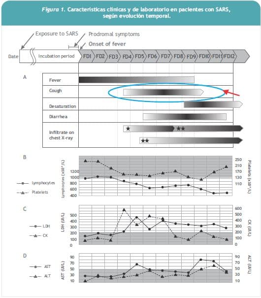 En el año 2004 aparecieron las primeras publicaciones sobre la experiencia adquirida sobre el cuadro clínico del SARS. En una de estas publicaciones se describe que los síntomas iniciales son inespecíficos: el enfermo comienza con fiebre, que se mantiene en el tiempo; luego aparece la tos, que no se presenta desde el inicio, sino que comienza alrededor del cuarto día; posteriormente sobreviene la insuficiencia respiratoria, que en un porcentaje importante de pacientes se acompaña de diarrea. En ese momento comienzan a aparecer alteraciones radiológicas, tales como infiltrados intersticiales y lobares. En el laboratorio se encuentra linfopenia al ingreso, en el 70% de los casos; menos frecuente es la trombocitopenia y el aumento de LDH, CK y enzimas hepáticas. El estudio mediante técnicas de PCR en muestras de aspirado nasofaríngeo permite identificar el agente etiológico en 85% de los enfermos (2) (Figura 1).