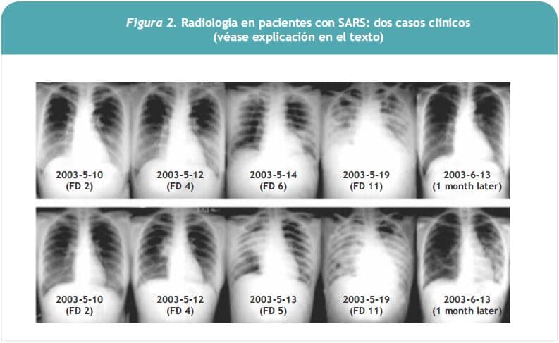 En la Figura 2 se observan distintos patrones radiológicos y su evolución en el tiempo en dos pacientes con SARS. En la serie superior se observa infiltrados intersticiales progresivos, que al mes tienden a la resolución completa; en la serie inferior se observa una imagen condensante en el lóbulo superior derecho que evoluciona a síndrome de distrés respiratorio agudo, con imágenes residuales tipo neumonía necrotizante al mes de evolución (2).