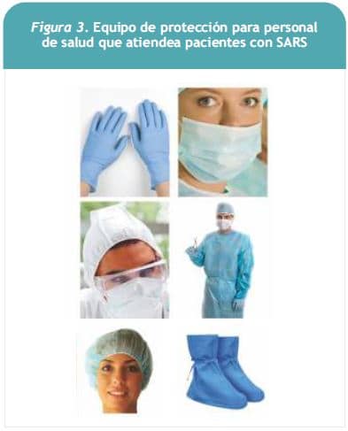 Si bien la tasa de letalidad global del SARS es de 15%, aumenta hasta 70% en individuos mayores de 60 años. Otros factores de riesgo de mortalidad por SARS son el sexo masculino y la presencia de alguna comorbilidad. La influencia del sistema de salud no está clara. En la Figura 3 se muestra el equipo de protección que se recomienda para el personal de salud que atienda a pacientes con SARS: de arriba abajo, gorro y bata, máscara número 95 y guantes, gafas y cubre calzado o botas quirúrgicas.