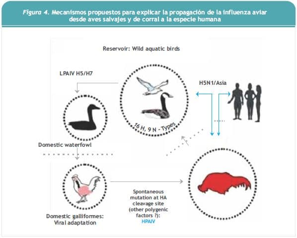 En Asia es común que la crianza de aves de corral se realice muy cerca de zonas residenciales, por lo que se cree que existiría un reservorio en aves salvajes a partir del cual se contaminarían las aves domésticas, en las cuales se produciría algún tipo de mutación espontánea que originaría una cepa altamente agresiva para la especie humana (Figura 4).