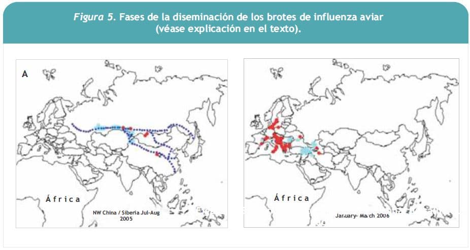 En los brotes estudiados de influenza aviar se ha descrito cinco fases de diseminación, de las cuales las más importantes son la 2 y la 4. Los brotes se iniciaron en China, en aves de corral; posteriormente el virus apareció en aves salvajes; en la fase 2, que ocurrió en verano de 2005, no se observó una propagación que siguiera las rutas de migración de las aves, sino las rutas de transporte comercial de ellas (Figura 5 A). Entre enero y marzo de 2006 ocurrió la fase 4, en la que se produjo la diseminación en aves de corral y salvajes en Europa, se identificaron brotes persistentes en Turquía y Rumania, se observó muerte de aves salvajes en pequeños números, principalmente gansos y, en menor grado, patos, y se produjeron brotes importantes en aves de corral en Alemania y Francia (Figura 5 B). Después de esto sobrevino la fase 5, en que se produjo la diseminación de este brote hacia África.