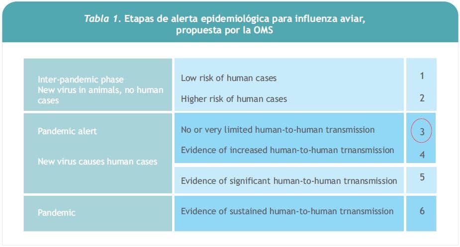 Junto con la expansión de este brote en aves silvestres y de corral se ha producido un aumento de los casos de infección humana por H5N1, lo que ha causado preocupación en todos los ministerios de salud y en la Organización Mundial de la Salud (OMS). El número acumulativo de casos de influenza aviar A/H5N1 ha aumentado de 4, en el año 2003, hasta 331 en septiembre de 2007, con una mortalidad de 61%. En cuanto a la vigilancia epidemiológica, la OMS describe seis fases, agrupadas en tres etapas: etapa inter-pandémica,etapa de alerta pandémica y etapa pandémica. La situación actual, a nivel global, es de alerta pandémica, que corresponde a la fase 3, en la cual el riesgo de infección humana es considerable y existen nuevos subtipos del virus en humanos, pero no existe transmisión humano-humano o ésta es muy limitada (Tabla I).