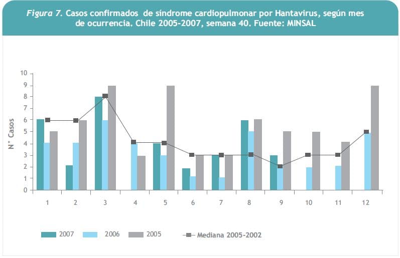 La vigilancia en Chile durante los últimos tres años muestra una incidencia estable, con predominio en los meses de verano (Figura 7). Lo que más preocupa es que la letalidad del cuadro también se ha mantenido estable, con cifras cercanas a 30%, con excepción del año 2006 en que aumentó a 44%.