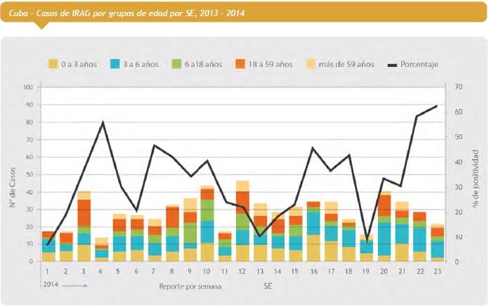 En Cuba, durante la SE 23, el número de hospitalizaciones asociadas a IRAG (n=21) disminuyó comparado a la SE anterior. La mayoría de casos de IRAG se registraron en el grupo 1-4 años de edad. No se reportó ningún fallecido asociado a IRAG durante este período. Según datos del laboratorio nacional, para las SE 20- 23 se procesaron 247 muestras, de las cuales el 42,1% resultaron positivas para virus respiratorios. Entre las muestras positivas, predominaron rinovirus (41,3%) y parainfluenza (34,6%).