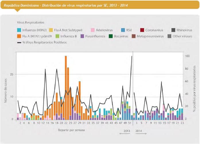 En República Dominicana, durante las SE 20-23, se analizaron 72 muestras, con un 22,2% de positividad para virus respiratorios y 11,1% para influenza. Entre las muestras positivas, se detectaron influenza A(H3N2) (50,0%) y parainfluenza (50,0%).