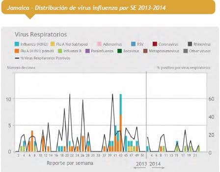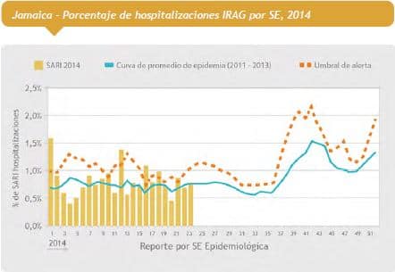 En Jamaica, según los datos de la vigilancia centinela para la SE 23, la proporción de consultas asociadas a IRA (3,7%) disminuyó respecto a la semana previa mientras la proporción de hospitalizaciones asociadas a IRAG (0,7%) incrementó. No se reportó ningún fallecido asociado a IRAG durante esta semana. Según datos del laboratorio correspondientes a las SE 20-23, se procesaron 50 muestras, de las cuales dos fueron positivas a influenza B.