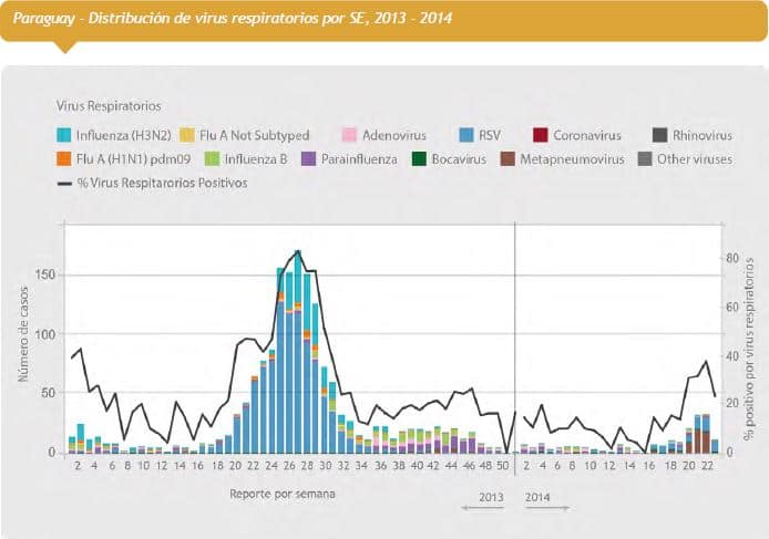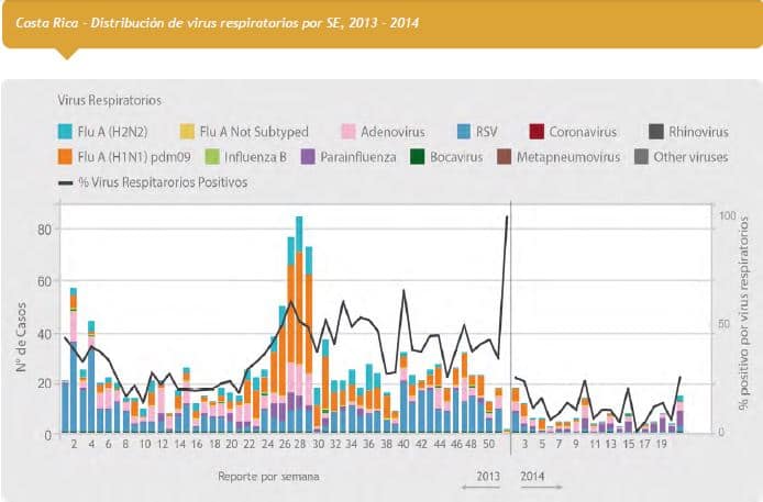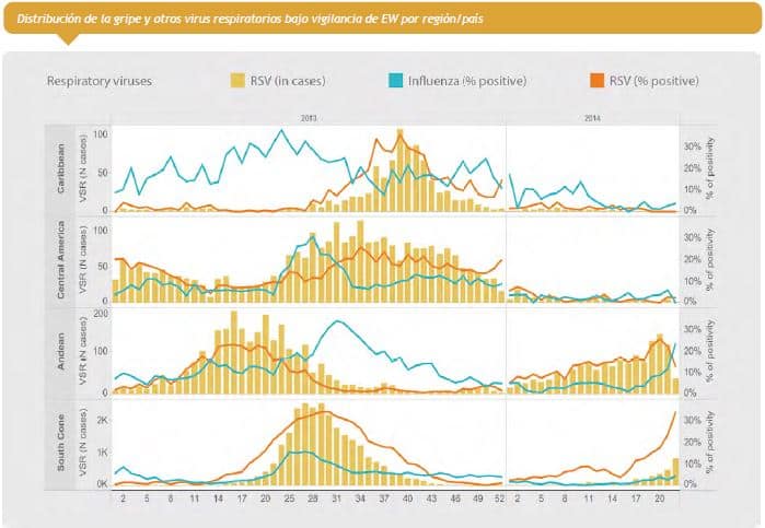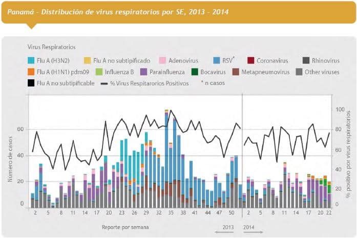 En Panamá, según los datos del laboratorio nacional entre las SE 19- 22, 132 muestras fueron analizadas, de las cuales, el porcentaje de positividad para virus respiratorios fue de 68,9% y para influenza fue de 17,4%. Entre las muestras positivas, predominaron parainfluenza (45,1%), rinovirus (27,5%) e influenza B (18,7%).
