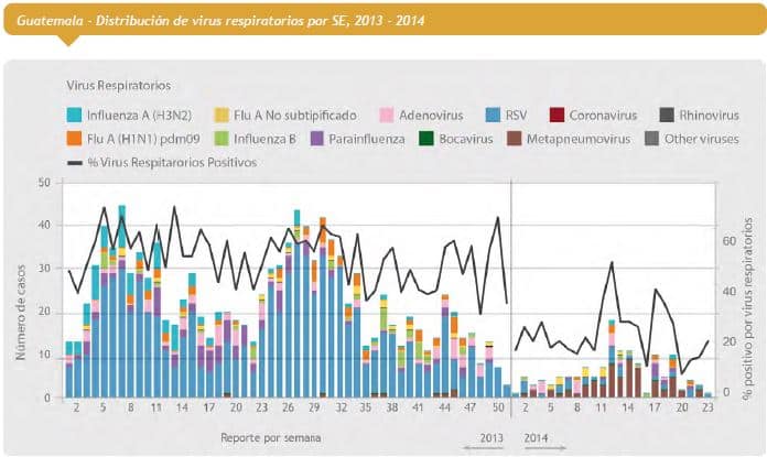 En Guatemala, según los datos del laboratorio entre las SE 20-23 se procesaron 80 muestras, de las cuales el porcentaje de positividad para virus respiratorios fue 12,5% y para virus de influenza 1,3%. Entre las muestras positivas, predominaron metapneumovirus humano (40,0%) y VSR (40,0%).